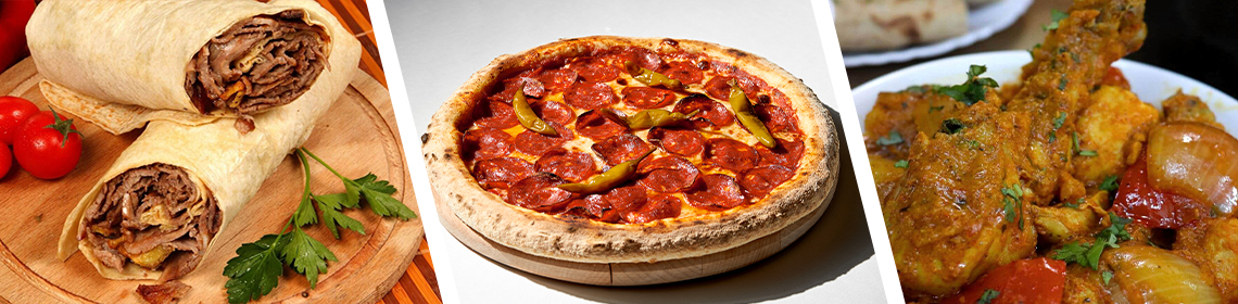 Any 12" Pizza, Half Chicken Parmo, 1/4lb Chicken Burger Or Cheeseburger, Portion Of Doner, Large Dip